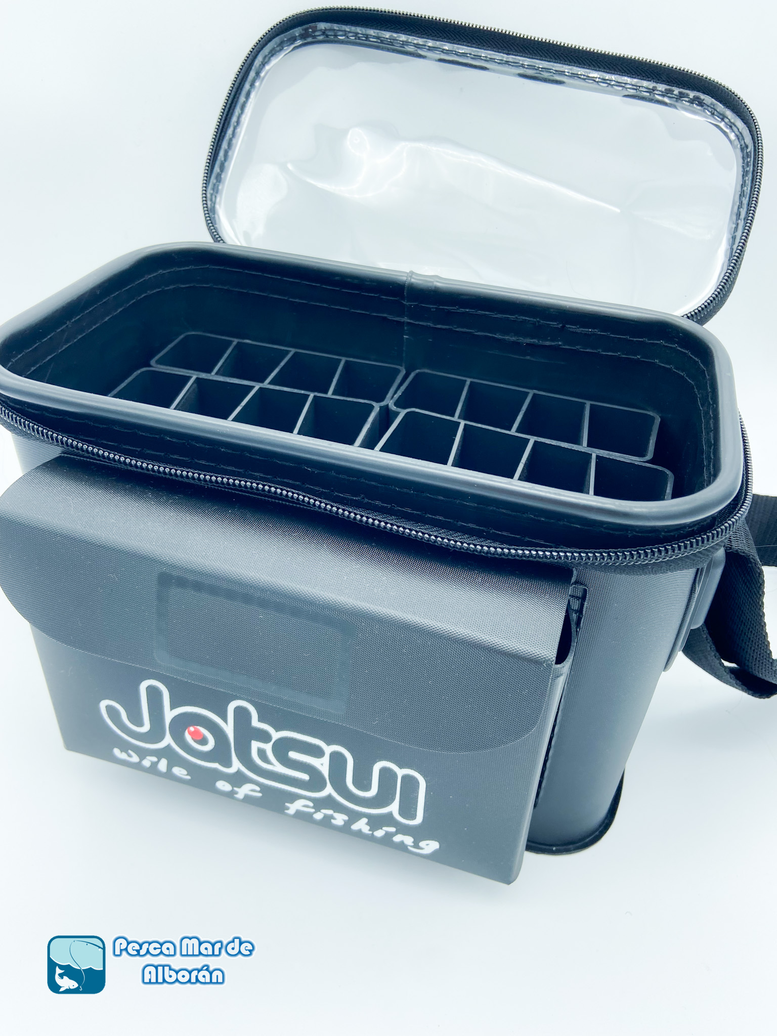 Estuche de la marca Jatsui con 24 departamentos para señuelos de hasta 21 cm de largo con tapa transparente para una mejor visibilidad de los mismos. – Tapa transparente – Inserciones extraíbles – Fondo perforado – Correa para el hombro – Bolsillo delantero grande – Con trabilla trasera. – Para señuelos de hasta 21 cm – Dimensiones 22 x 16 X 15.5 cm